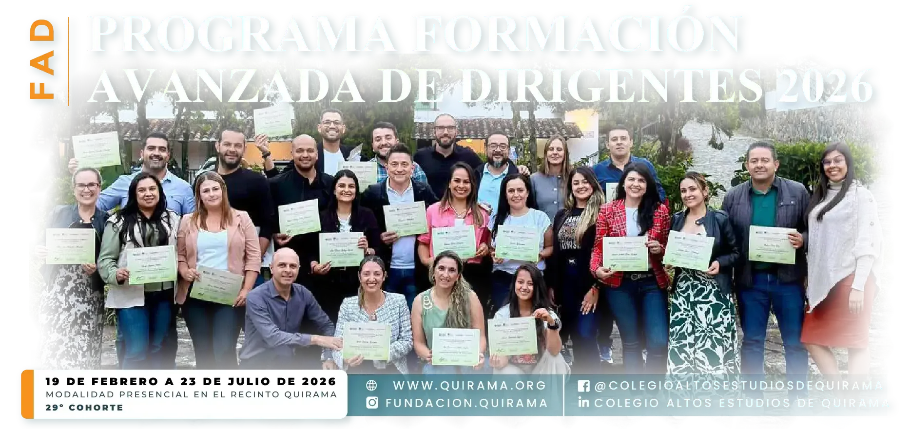Desde 1993, el Colegio Altos Estudios de Quirama, entidad que tiene más de 60 años de vida, ha venido ofreciendo a la sociedad el programa Formación Avanzada de Dirigentes −FAD−, dentro nuestra intención misional de definirnos como una escuela de liderazgo.