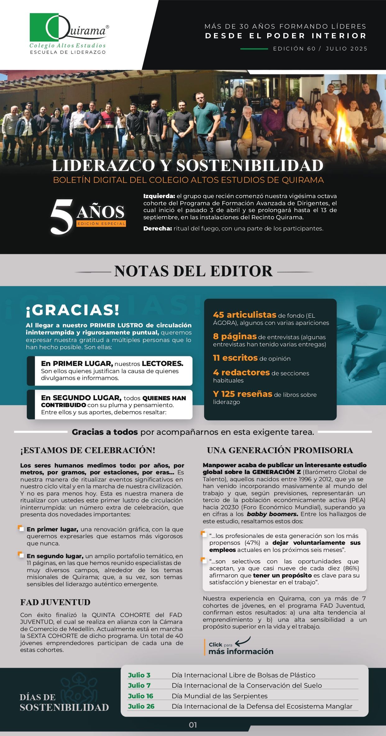 Nuestra experiencia en Quirama, con ya más de 7 cohortes de jóvenes, en el programa FAD Juventud, confirma estos resultados: a) una alta tendencia al emprendimiento y b) una alta sensibilidad a un propósito superior en la vida y el trabajo.