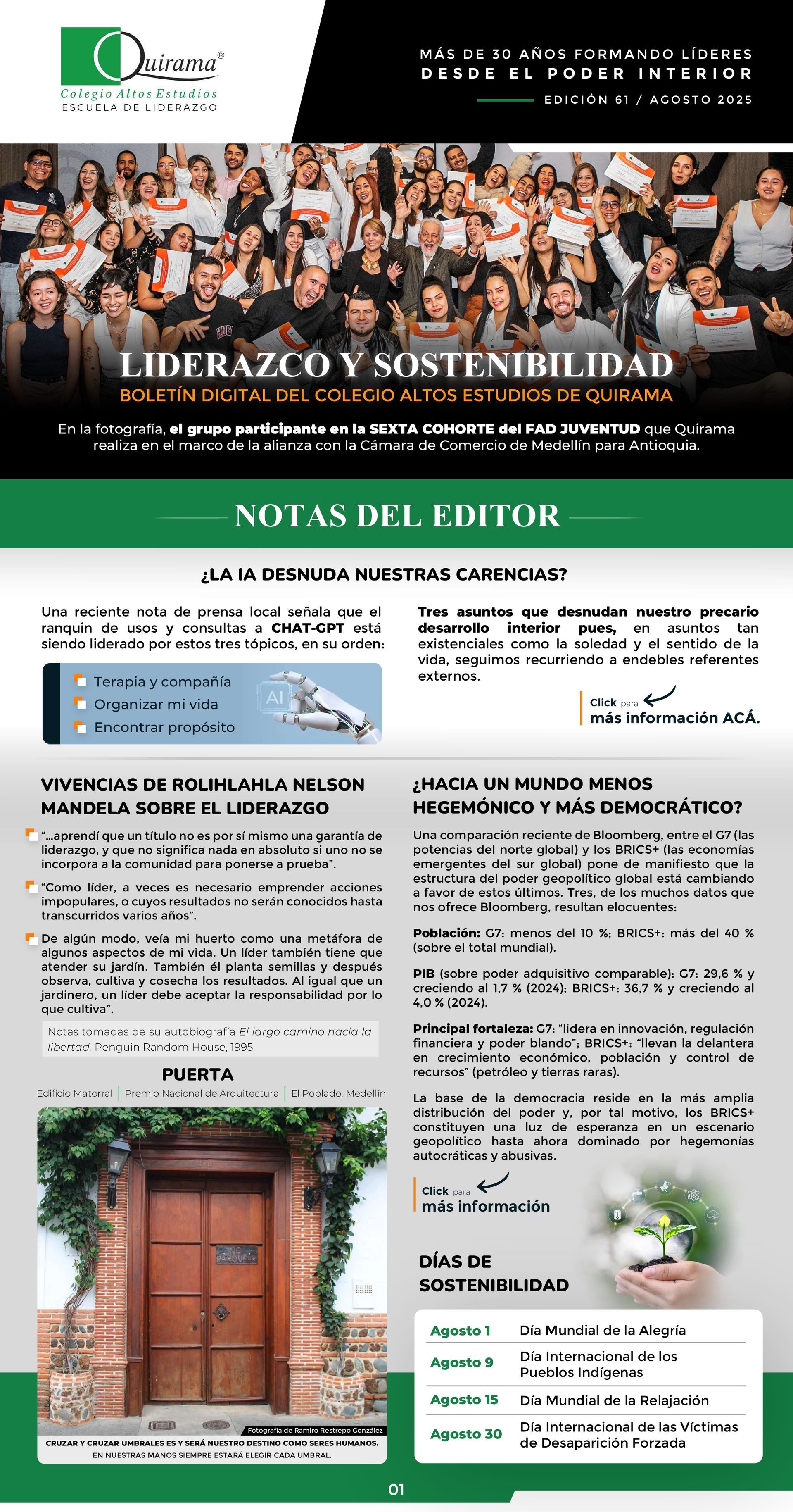 El mundo en que vivimos (la tierra y la sociedad humana) fue construido como resultado de decisiones tomadas, tanto por dirigentes como por todos nosotros, dentro de una dinámica compleja de interacciones, que ocurren dentro del sistema social y cultural. Hay una multicausalidad en la complejidad, en la cual sobresale el papel de los dirigentes (llamados líderes) quienes, con sus decisiones, tienen el poder de inspirar direcciones y caminos a sus grupos de influencia. Dicha capacidad, principalmente de forma inconsciente, si es alimentada de forma constante por los intereses individuales, denominados intereses egóicos (por nuestra natural tentación narcisista), se convierte en lo que denominamos poder externo. Este tipo de poder tiende a no ver, o a desconocer, las necesidades propias del bien general (o del bien común), así como a ser ciego frente a nuestra realidad plurirrelacional, que incluye las necesidades propias de la vida. Cuando nosotros padecemos de este tipo de ceguera (culturalmente alimentada), podemos decir que estamos en el campo del antiliderazgo. La dinámica contraria es la dinámica propia del liderazgo auténtico, que obedece a una consciencia, en la cual nos hemos dado cuenta de que el poder personal solo es útil cuando se pone al servicio de los demás, y de todo lo demás. Este poder es el poder auténtico que surge solo cuando nos encontramos en un estado de armonía interior. Y es un tipo de poder que, por su influencia positiva, está repercutiendo en el mundo en forma de cocreación evolutiva continua; y que, cuando lo encarnamos, manifiesto en valores, nos convierte en auténticos líderes, haciendo una gran diferencia en el mundo. Para avanzar en ese proceso de cultivo interior, y por consiguiente de crecer en nuestro liderazgo, los libros que hoy reseñamos nos ayudan a abrir los ojos y ver de forma nueva. El desarrollo organizacional y social se da en la medida en que crezcamos en consciencia y nos cultivemos interiormente. La salida es hacia dentro.